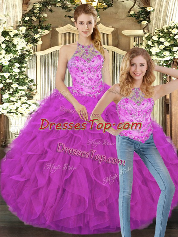 Pretty Halter Top Sleeveless Tulle Ball Gown Prom Dress Beading and Ruffles Lace Up