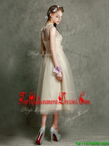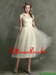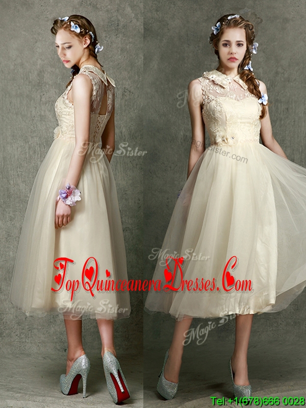 Pretty High Neck Champagne Quinceanera Dama Dress with Lace and Hand Made Flowers