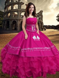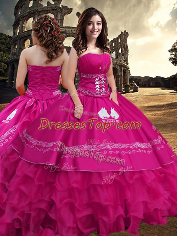 Pretty Hot Pink Sweet 16 Dresses Military Ball and Sweet 16 and Quinceanera with Embroidery and Ruffled Layers Strapless Sleeveless Zipper