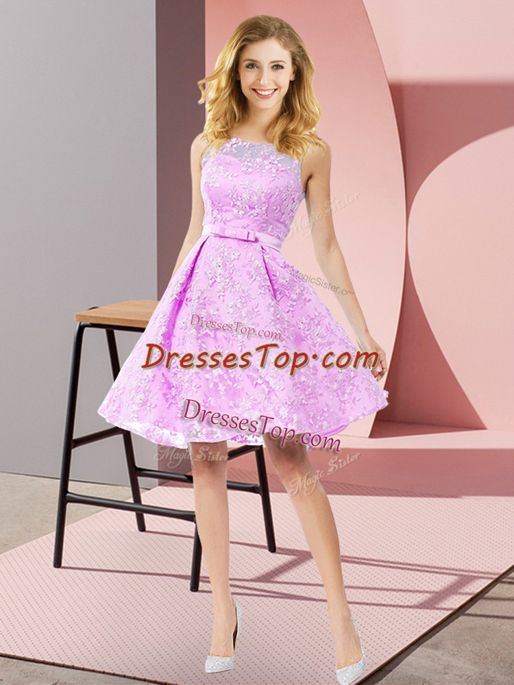 Pretty Lilac A-line Scoop Sleeveless Lace Knee Length Zipper Bowknot Court Dresses for Sweet 16