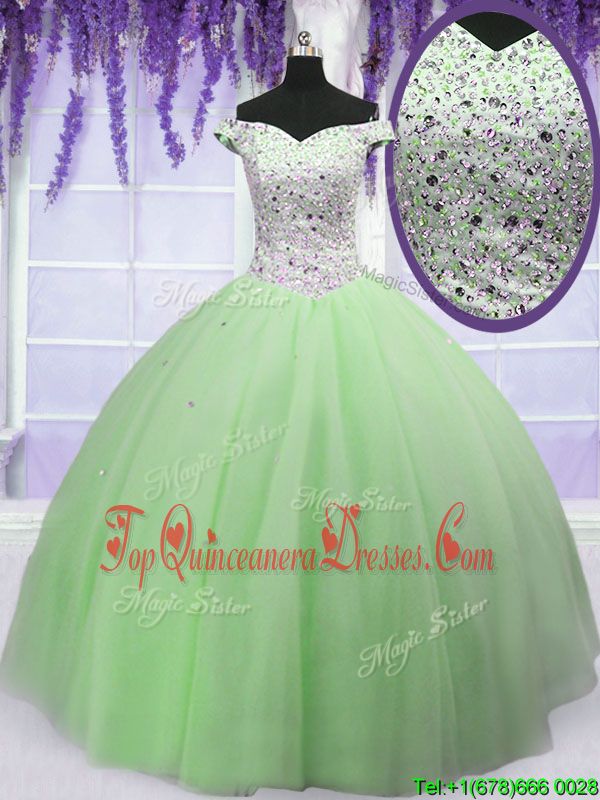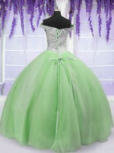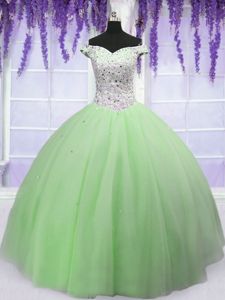 Pretty Off the Shoulder Tulle Short Sleeves Floor Length Ball Gown Prom Dress and Beading