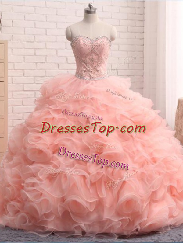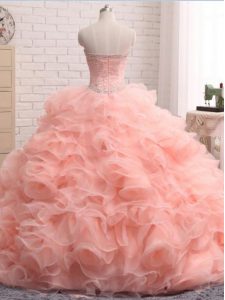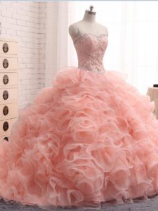 Pretty Pink Organza Zipper Sweetheart Sleeveless Floor Length Vestidos de Quinceanera Beading and Ruffles