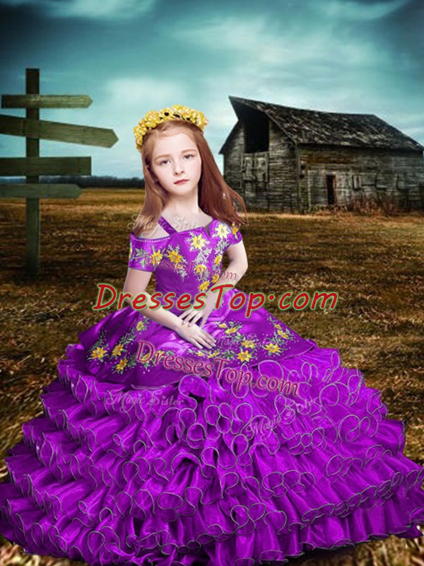 Pretty Purple Ball Gowns Embroidery and Ruffled Layers Pageant Gowns For Girls Lace Up Organza Short Sleeves Floor Length