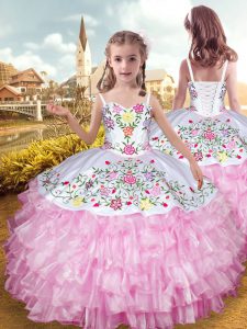 Pretty Rose Pink Organza and Taffeta Lace Up Sweetheart Sleeveless Floor Length Vestidos de Quinceanera Embroidery and Ruffled Layers