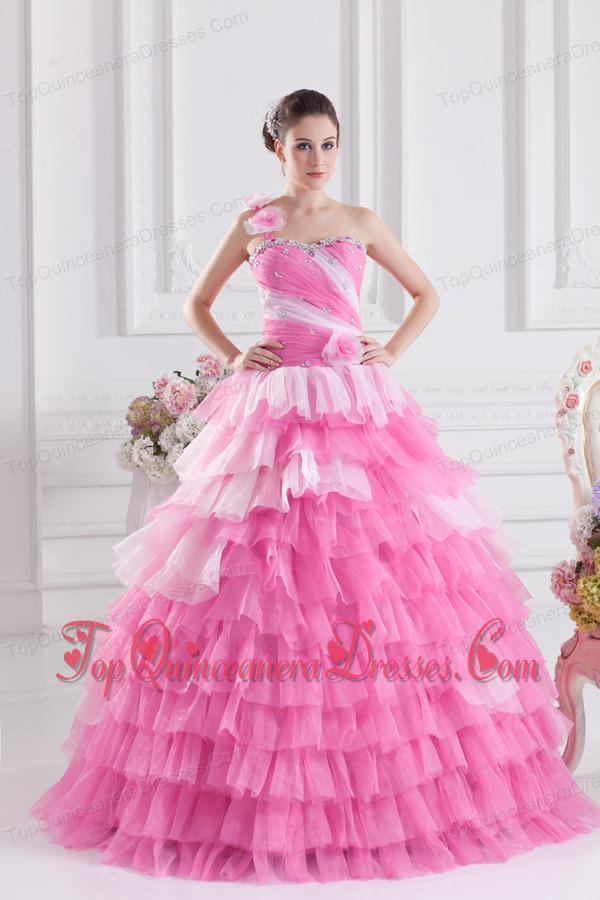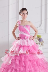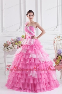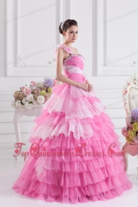 Pretty Rose Pink Princess One Shoulder Beading Quinceanera Dress with Ruffled Layers