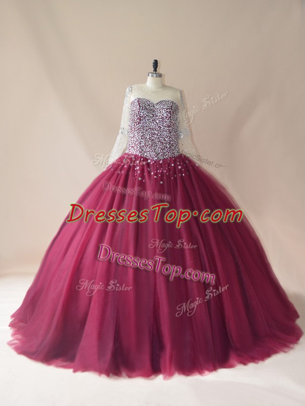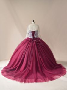 Pretty Scoop Long Sleeves Brush Train Lace Up Sweet 16 Quinceanera Dress Burgundy Tulle