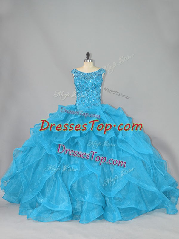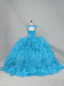 Pretty Sleeveless Beading and Ruffles Lace Up Quinceanera Dresses with Aqua Blue Brush Train