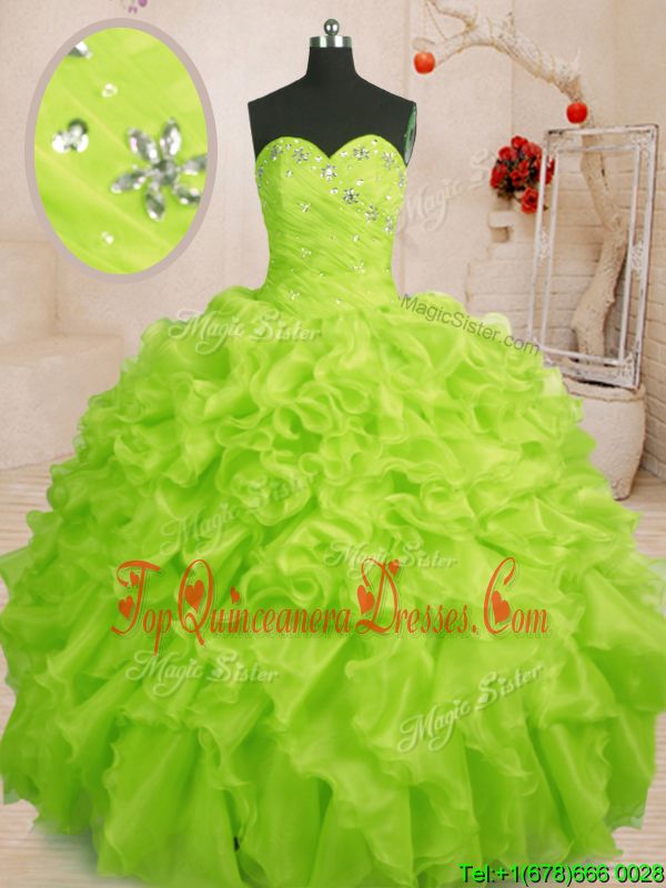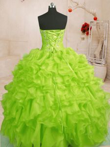 Pretty Sleeveless Floor Length Beading and Ruffles Lace Up Ball Gown Prom Dress with Yellow Green