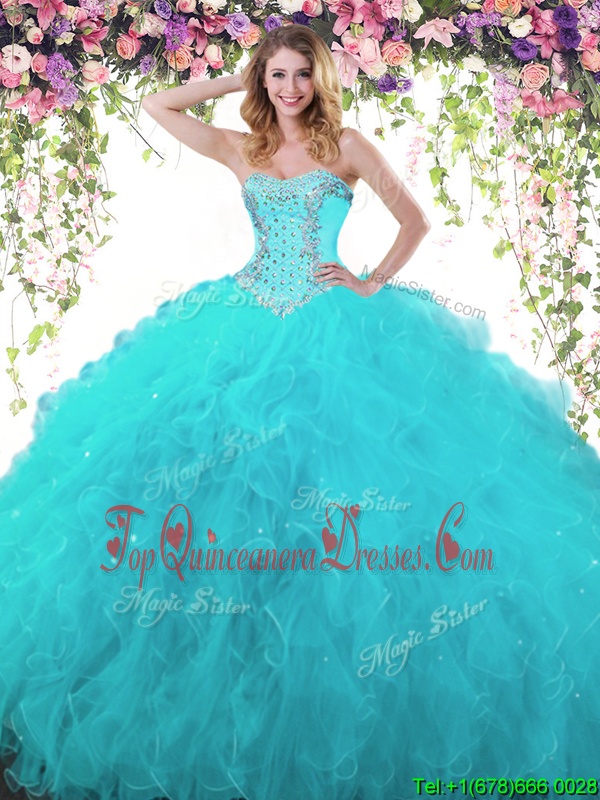 Pretty Teal Quince Ball Gowns Military Ball and Sweet 16 and Quinceanera and For with Beading and Ruffles Sweetheart Sleeveless Lace Up