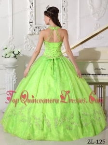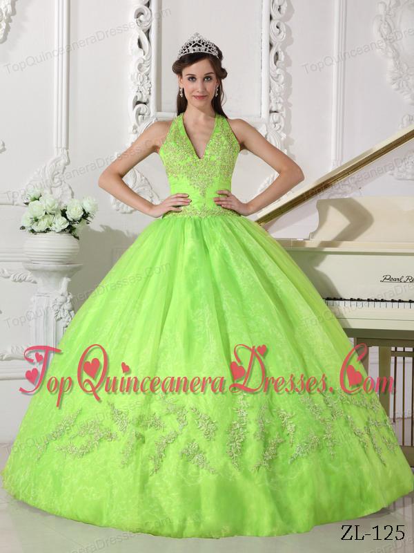 Pretty Yellow Green Ball Gown Halter Floor-length Taffeta and Organza Appliques Quinceanera Dress