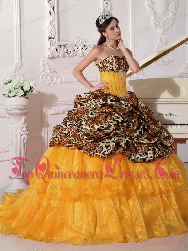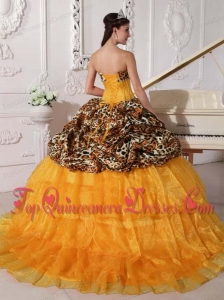 Print Orange Ball Gown Sweetheart Sweep / Brush Train Leopard and Organza Appliques Quinceanera Dress