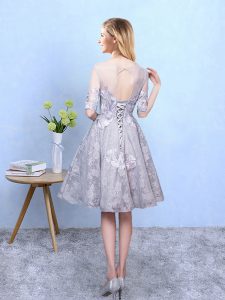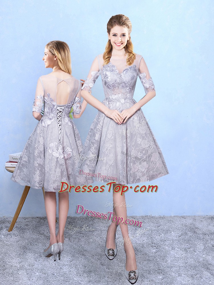 Printed Scoop Half Sleeves Lace Up Appliques Damas Dress in Grey