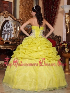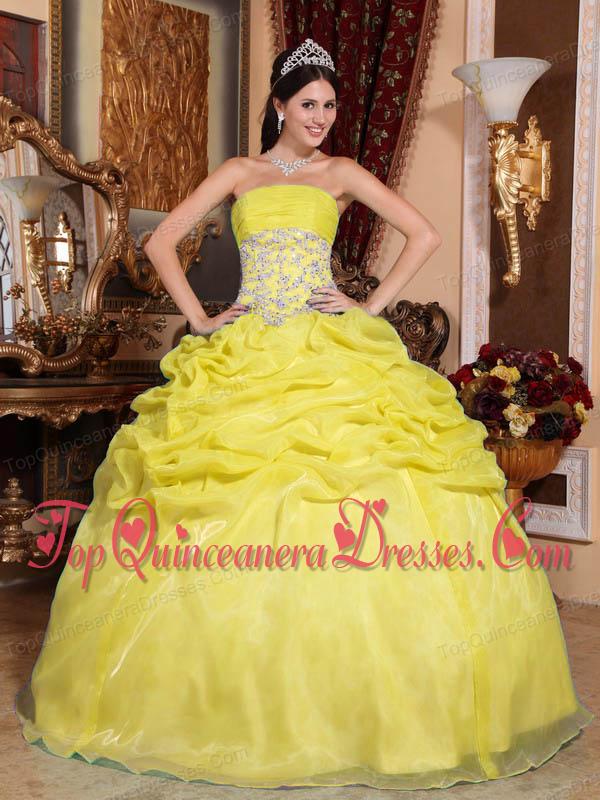 Puffy Yellow Ball Gown Strapless Floor-length Organza Appliques Sweet 16 Gowns
