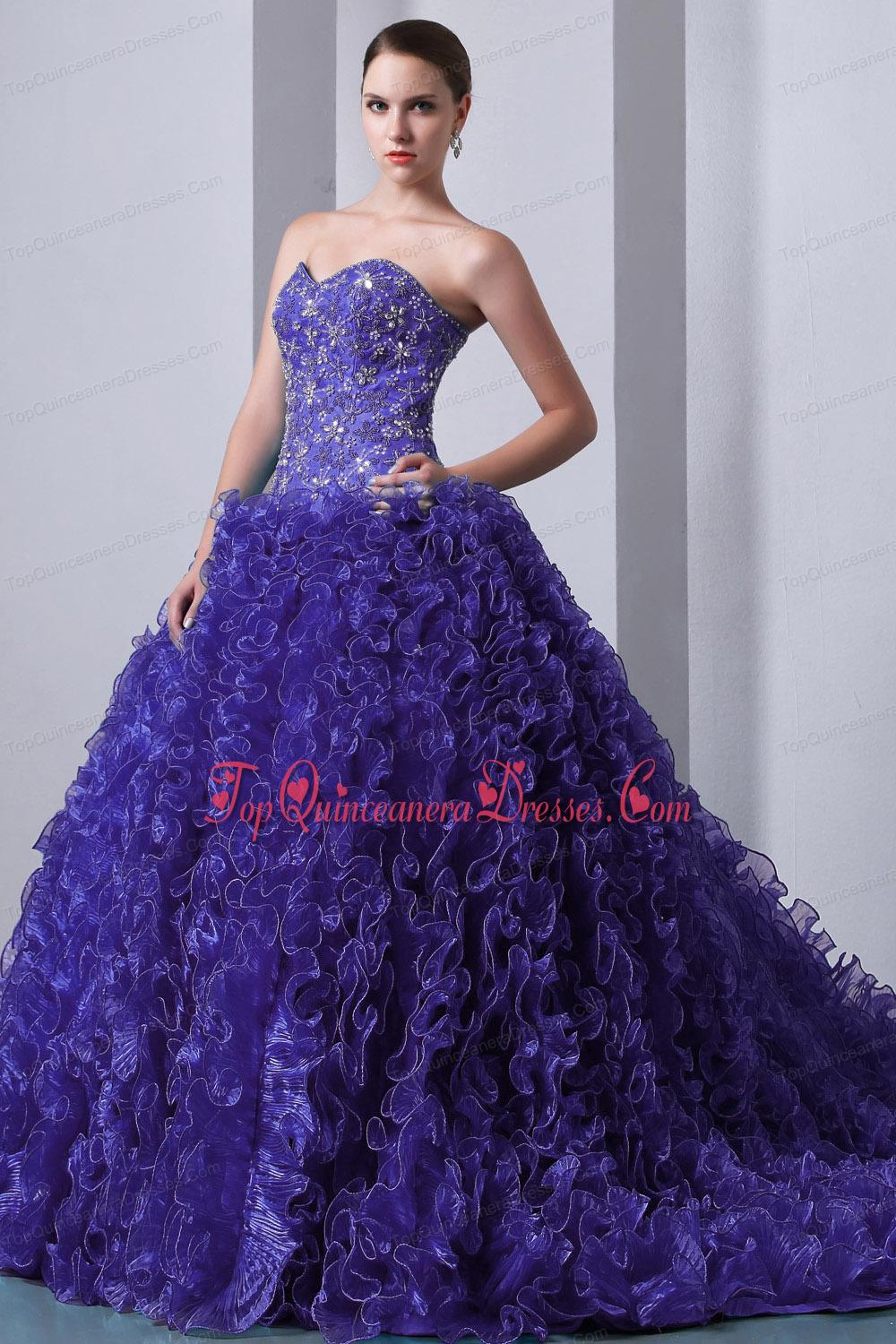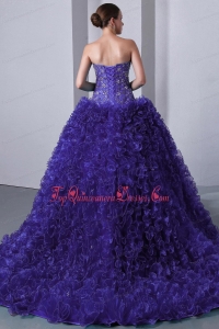 Purple A-Line / Princess Sweetheart Brush Train Organza Beading and Ruffles Quinceanea Dress