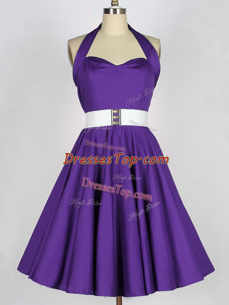 Purple A-line Taffeta Halter Top Sleeveless Ruching Knee Length Zipper Court Dresses for Sweet 16