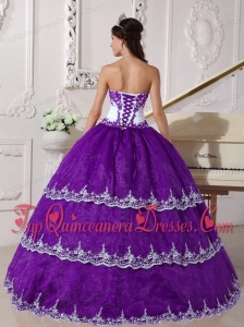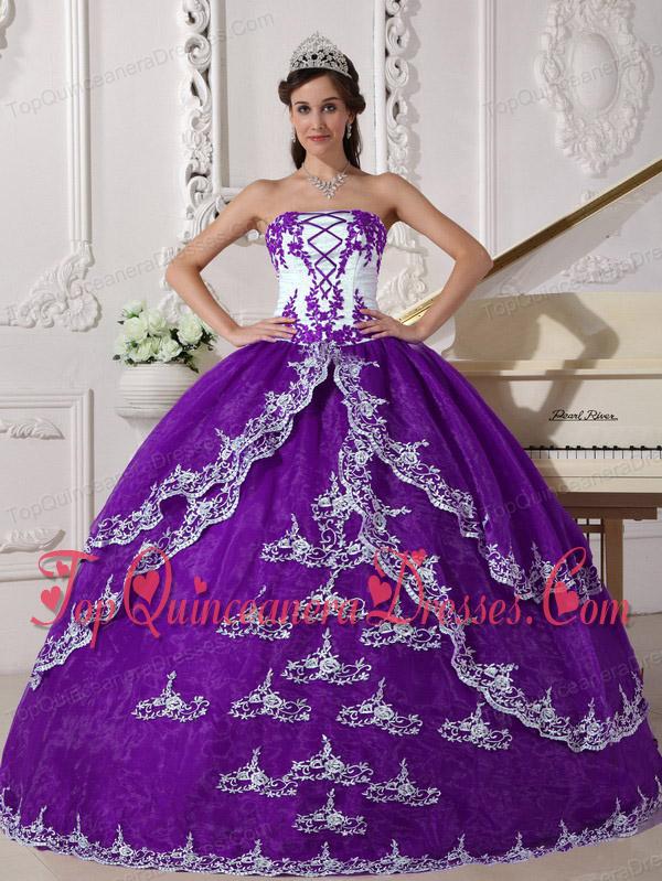 Purple and White Ball Gown Strapless Floor-length Organza Appliques Fashionable Quinceanera Dress