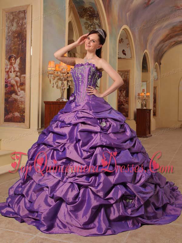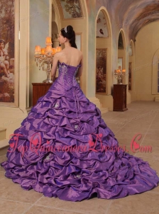 Purple Ball Gown Strapless Court Train Pick-ups Taffeta Unique Quinceanera Dress