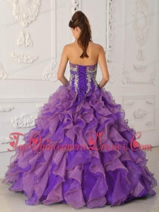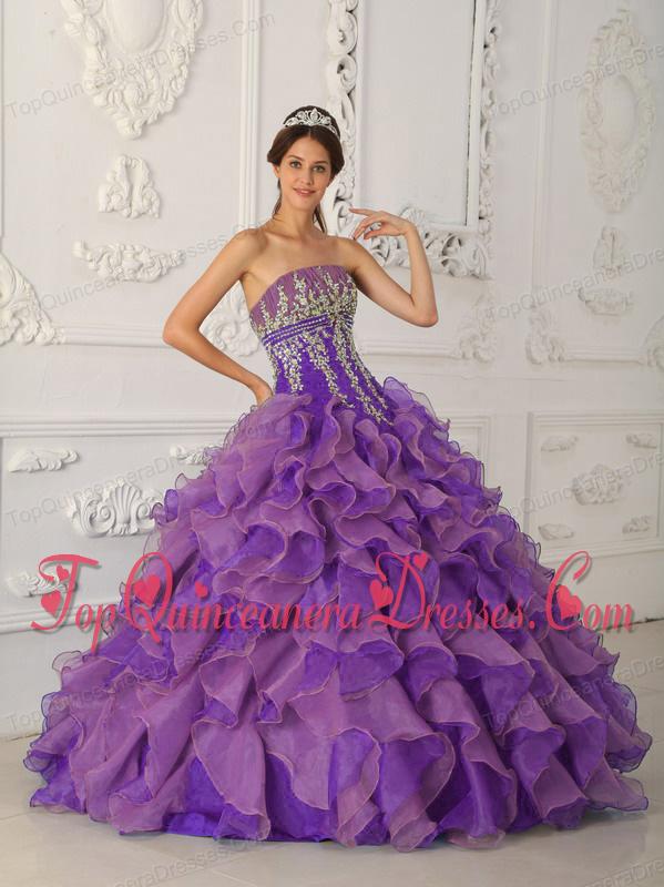 Purple Ball Gown Strapless Floor-length Organza Beading and Appliques Quinceanera Dress
