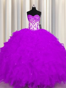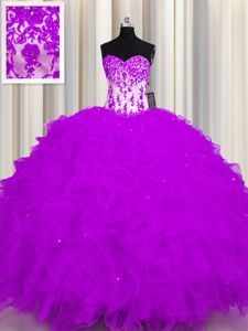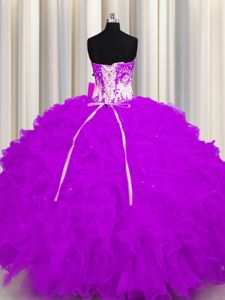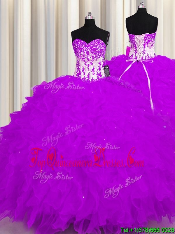 Purple Ball Gowns Appliques and Ruffles Ball Gown Prom Dress Lace Up Organza Sleeveless Floor Length