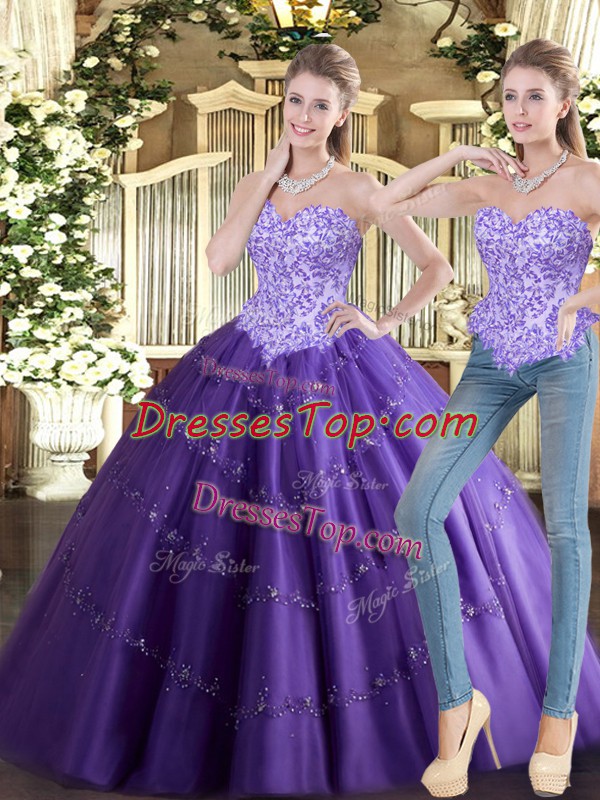 Purple Ball Gowns Beading Ball Gown Prom Dress Lace Up Tulle Sleeveless Floor Length