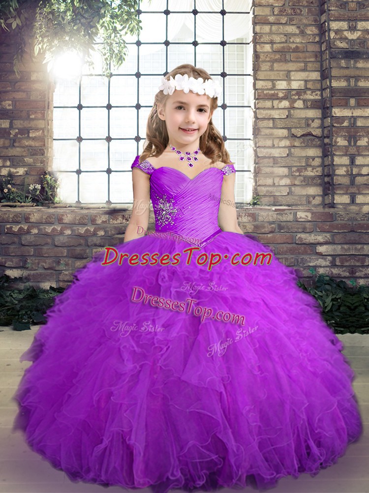 Purple Ball Gowns Straps Sleeveless Tulle Floor Length Lace Up Beading and Ruffles Kids Pageant Dress