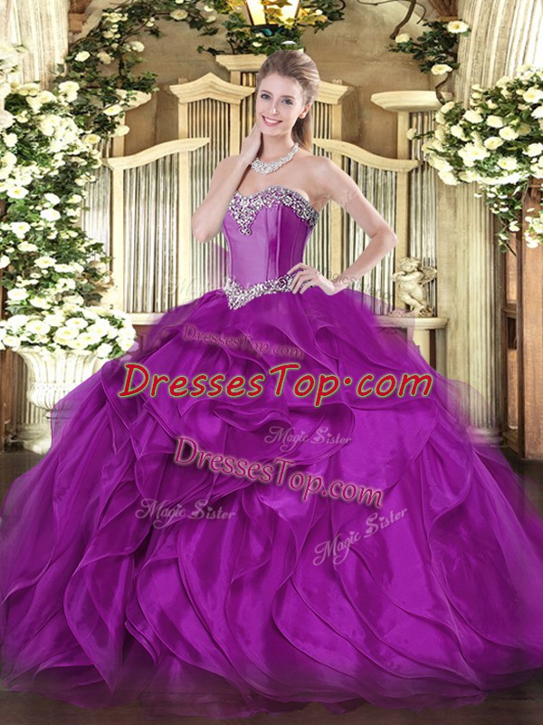 Purple Ball Gowns Sweetheart Sleeveless Organza Floor Length Lace Up Beading and Ruffles Quince Ball Gowns