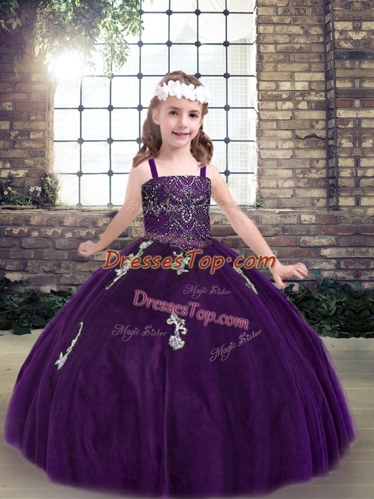 Purple Ball Gowns Tulle Straps Sleeveless Appliques Floor Length Lace Up Little Girl Pageant Gowns