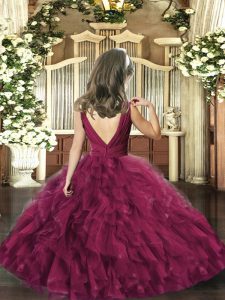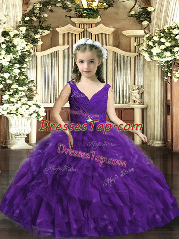 Purple Ball Gowns V-neck Sleeveless Organza Floor Length Backless Beading and Ruffles Kids Pageant Dress