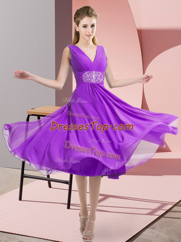Purple Empire V-neck Sleeveless Chiffon Knee Length Side Zipper Beading Vestidos de Damas
