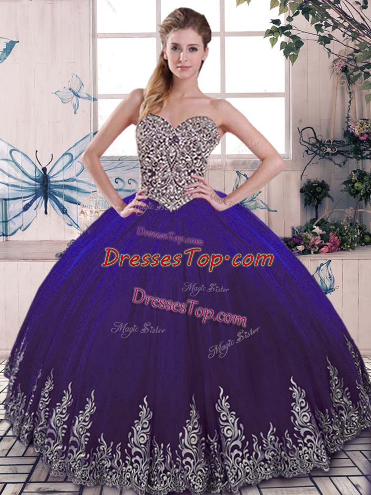 Purple Lace Up 15th Birthday Dress Beading and Embroidery Sleeveless Floor Length