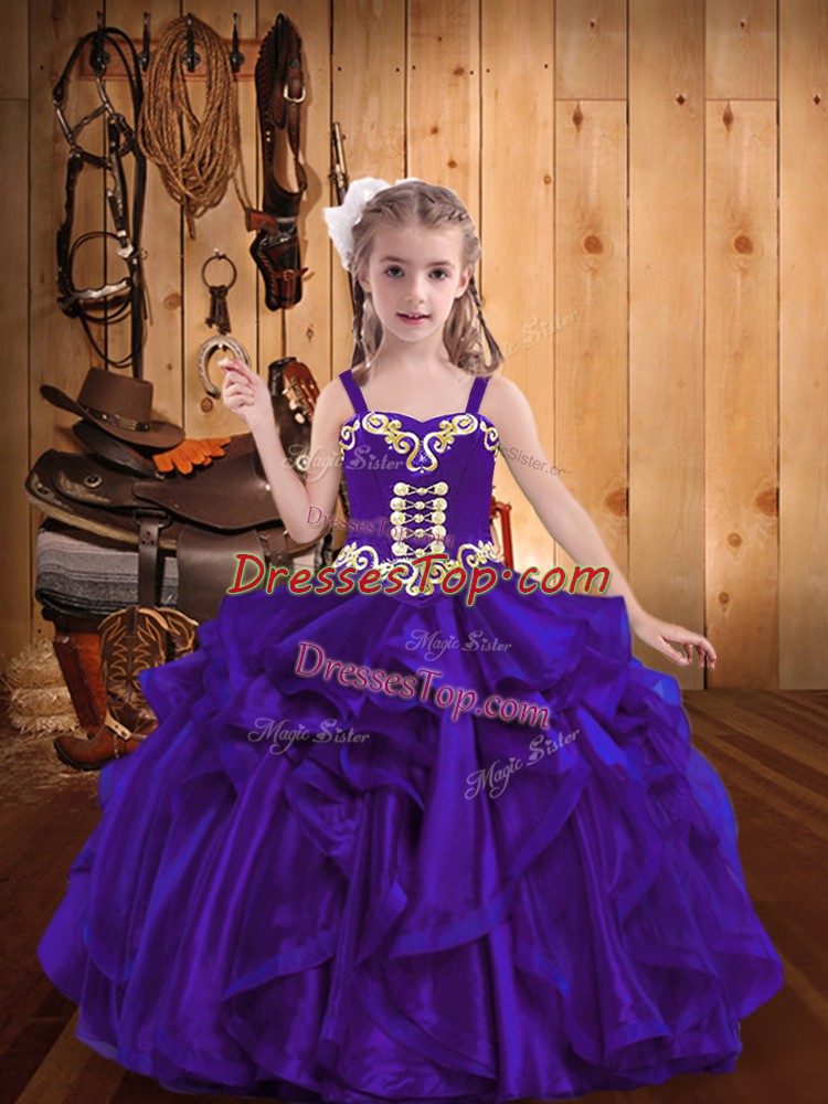 Purple Lace Up Pageant Dress Toddler Embroidery and Ruffles Sleeveless Floor Length