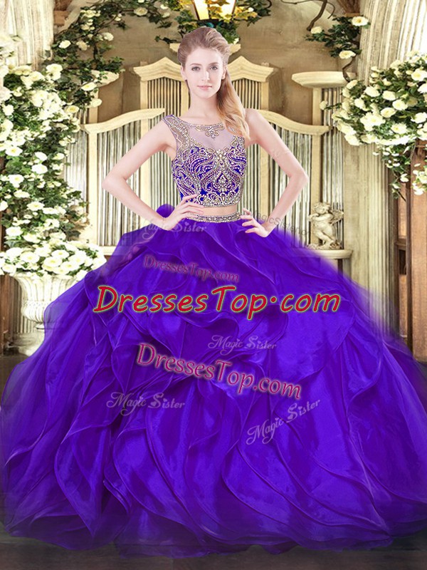 Purple Lace Up Scoop Beading and Ruffles Sweet 16 Dress Organza Sleeveless