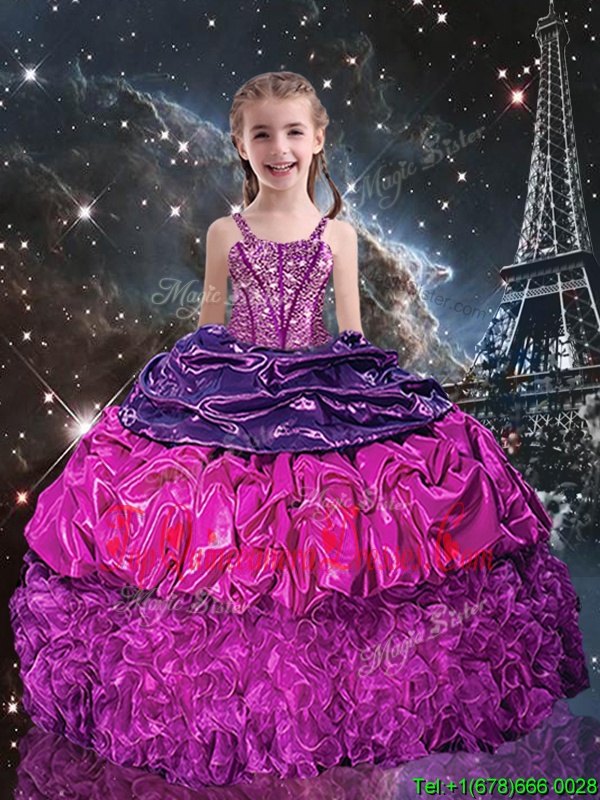 Purple Little Girl Pageant Gowns Party and Wedding Party and For with Beading and Ruffles and Pick Ups Spaghetti Straps Sleeveless Lace Up