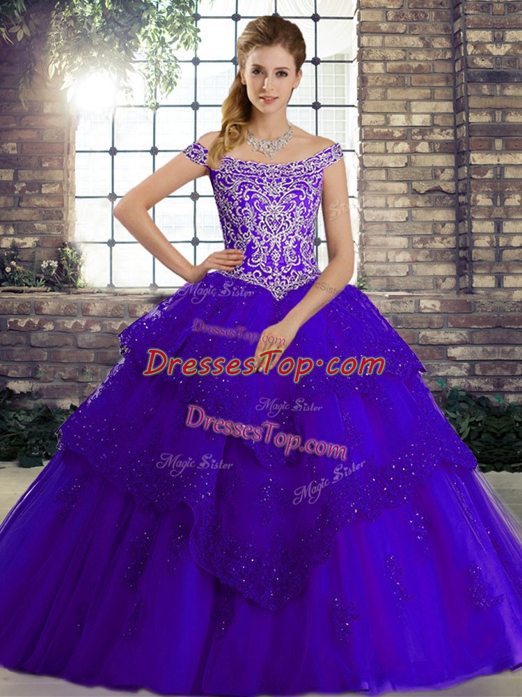 Purple Off The Shoulder Lace Up Beading and Lace Ball Gown Prom Dress Brush Train Sleeveless