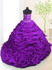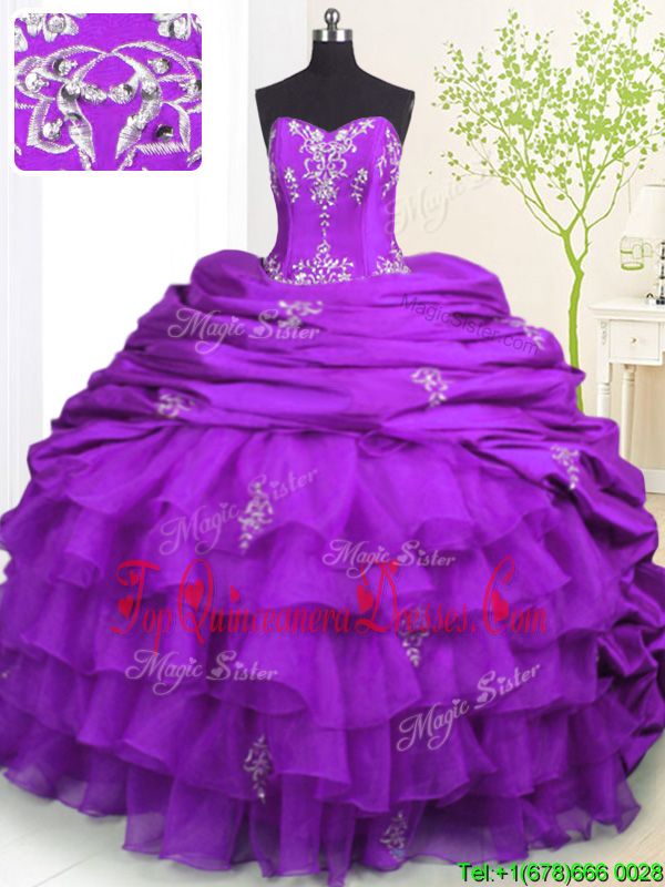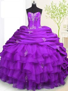 Purple Organza and Taffeta Lace Up Strapless Sleeveless With Train 15th Birthday Dress Brush Train Beading and Appliques and Ruffled Layers and Pick Ups