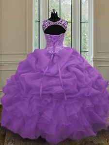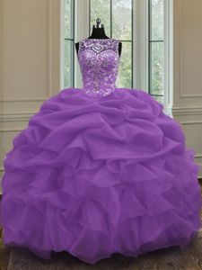 Purple Organza Lace Up Scoop Sleeveless Floor Length Quinceanera Gowns Beading and Pick Ups