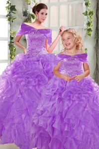 Purple Organza Lace Up Strapless Sleeveless Floor Length Quince Ball Gowns Beading and Ruffles