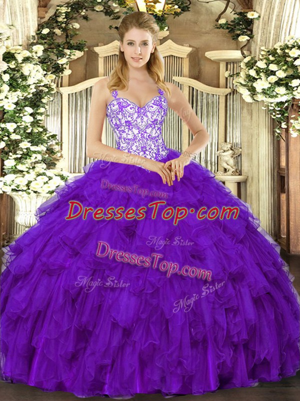 Purple Organza Lace Up Straps Sleeveless Floor Length Ball Gown Prom Dress Beading and Ruffles