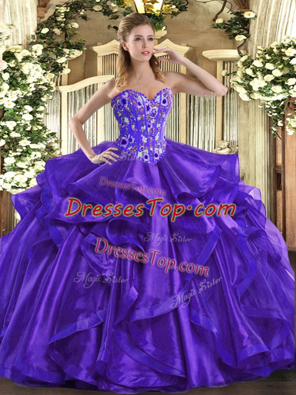 Purple Organza Lace Up Sweetheart Sleeveless Floor Length Sweet 16 Dresses Embroidery and Ruffles
