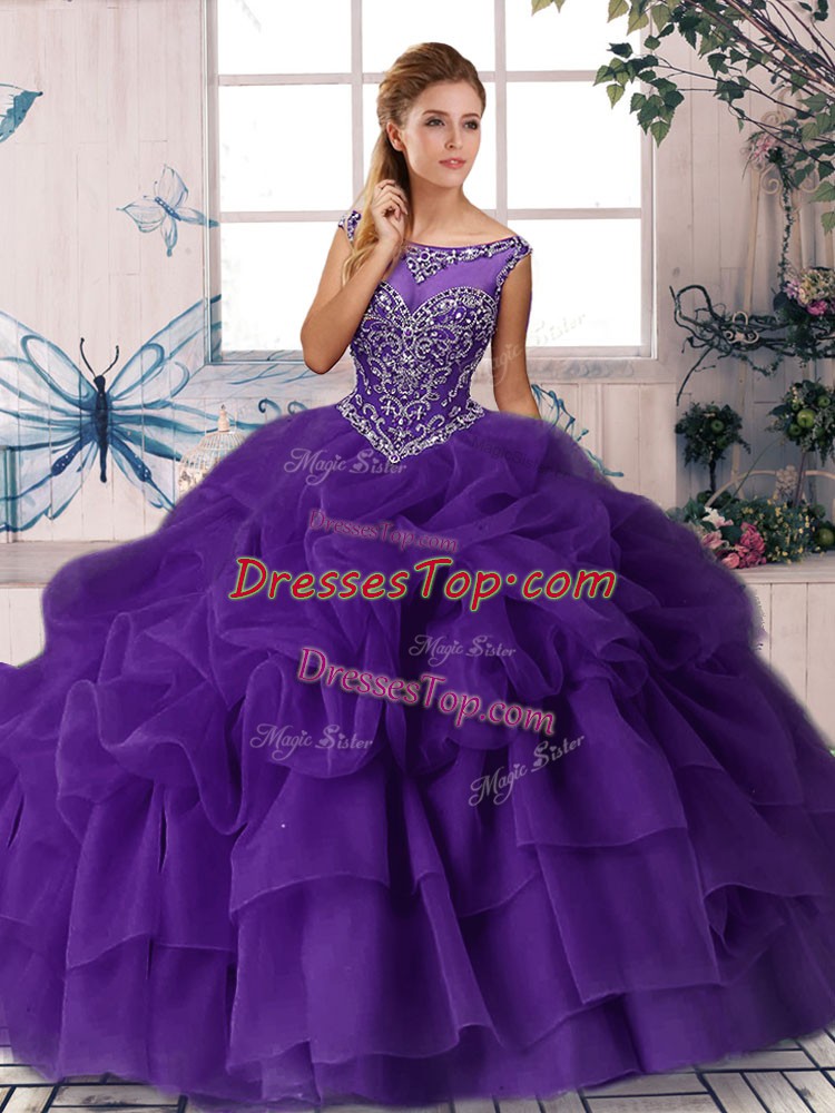 Purple Quince Ball Gowns Military Ball and Sweet 16 and Quinceanera with Beading and Pick Ups Scoop Sleeveless Brush Train Zipper