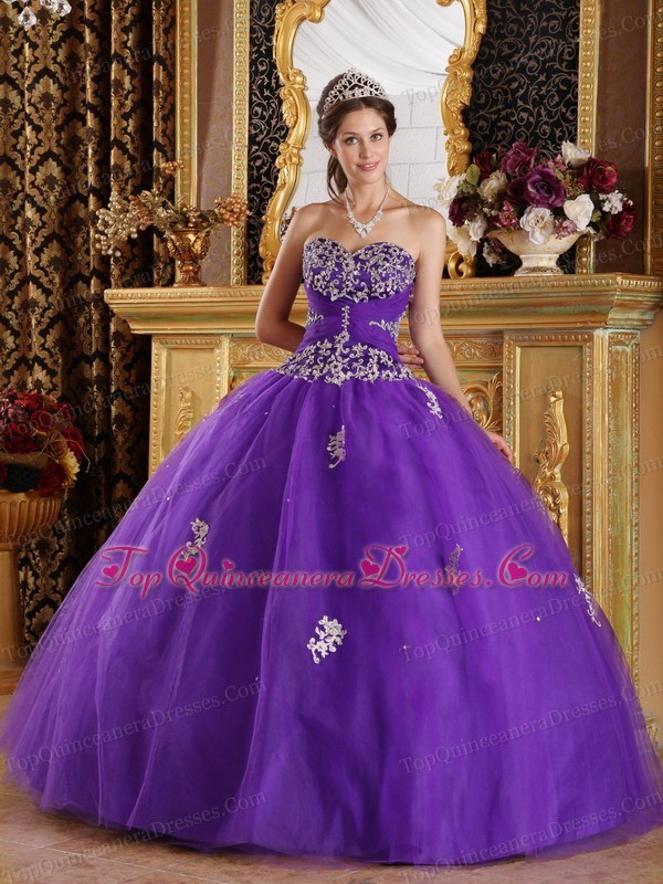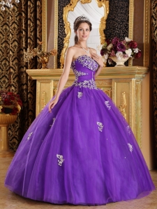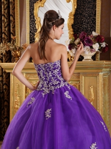 purple strapless quinceanera dress with appliques,