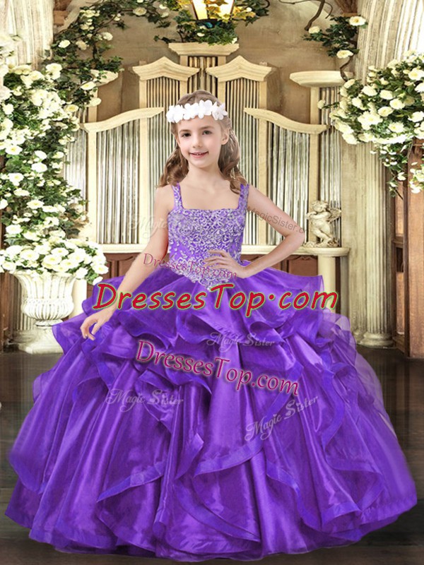 Purple Sleeveless Floor Length Beading and Ruffles Lace Up Kids Formal Wear