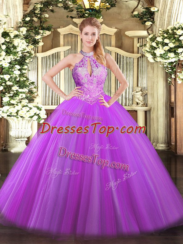 Purple Sleeveless Floor Length Sequins Lace Up Ball Gown Prom Dress