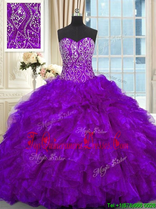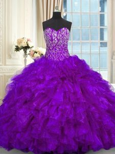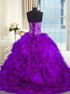 Purple Sleeveless Organza Brush Train Lace Up Quinceanera Gowns for Military Ball and Sweet 16 and Quinceanera