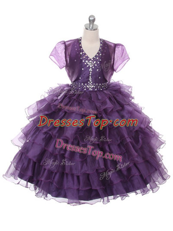 Purple Sleeveless Organza Lace Up Girls Pageant Dresses for Wedding Party