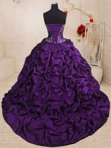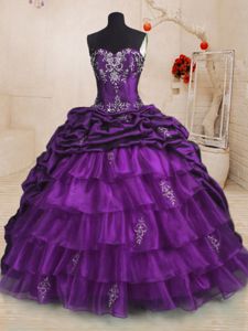 Purple Sleeveless Sweep Train Beading and Appliques and Ruffled Layers and Pick Ups With Train Quinceanera Dresses