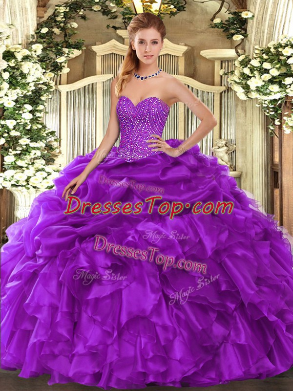 Purple Sweetheart Lace Up Beading and Ruffles and Pick Ups Quinceanera Gown Sleeveless