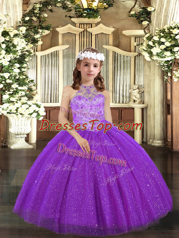 Purple Tulle Lace Up Halter Top Sleeveless Floor Length Kids Pageant Dress Beading