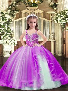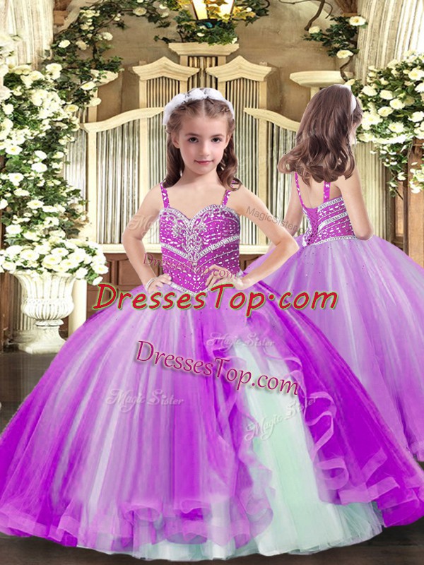 Purple Tulle Lace Up Spaghetti Straps Sleeveless Floor Length Little Girls Pageant Gowns Beading