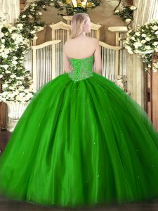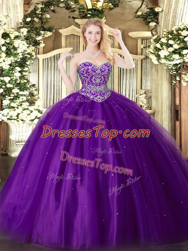 Purple Tulle Lace Up Sweetheart Sleeveless Floor Length Ball Gown Prom Dress Beading